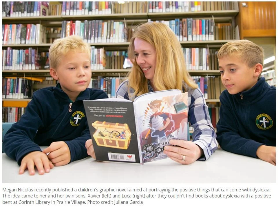 Last spring, on a trip to the Johnson County Library’s Corinth branch in Prairie Village, Megan Nicolas and her twin sons Luca and Xavier noticed a lack of books that portrayed dyslexia positively. So they decided to write their own children’s graphic novel to fill that gap.